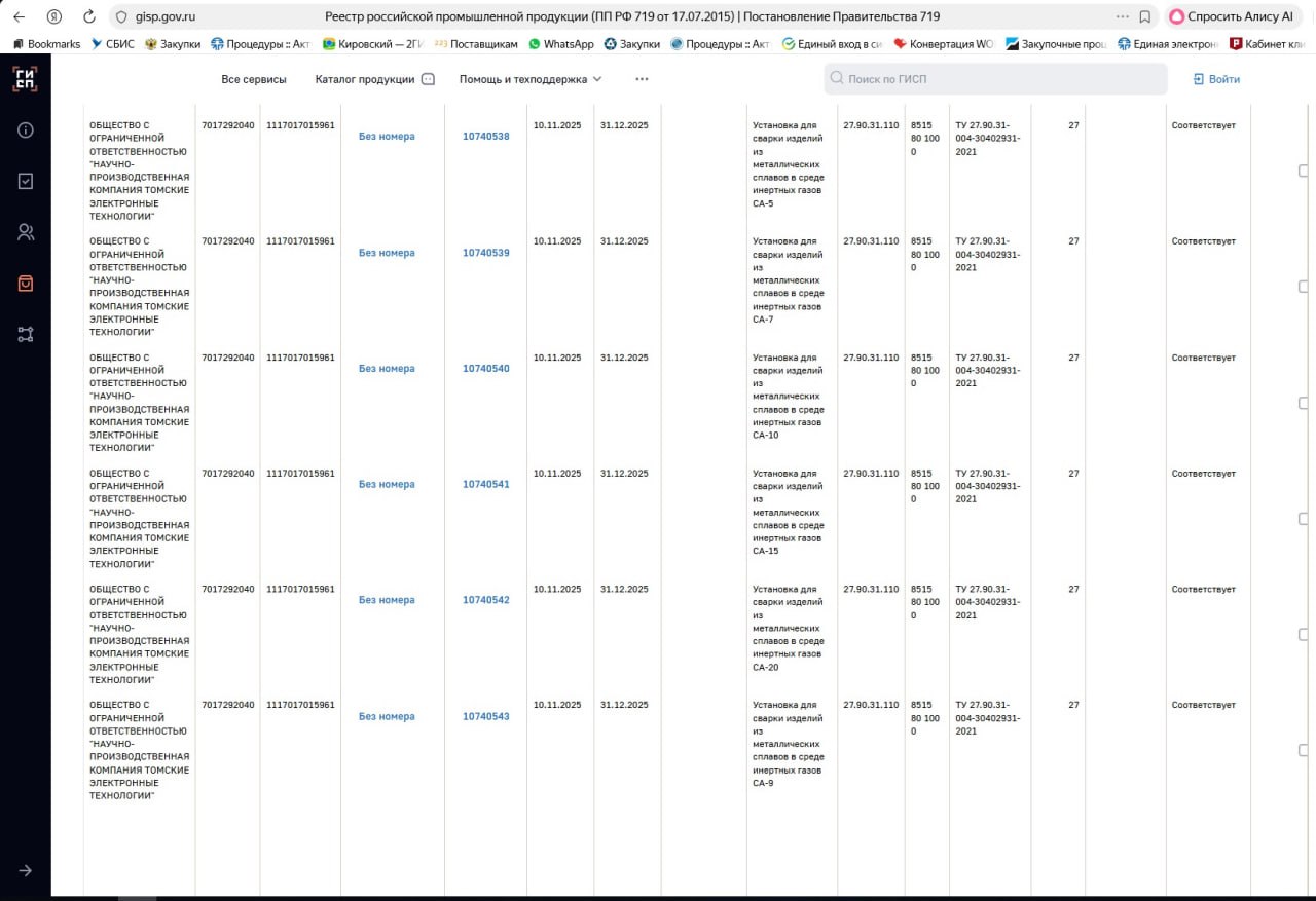 Шесть установок для сварки изделий из металлических сплавов в среде инертных газов